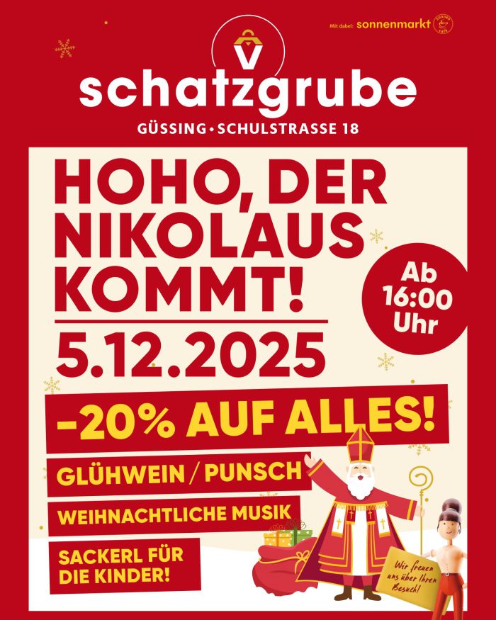 Die Schatzgrube Güssing lädt am Freitag, dem 5. Dezember 2025, zu einem besonderen Adventhighlight ein. Ab 16:00 Uhr dürfen sich Besucherinnen und Besucher auf den traditionellen Nikolausbesuch freuen, der vor allem den jüngsten Gästen ein strahlendes Lächeln ins Gesicht zaubern wird. Der Nikolaus nimmt sich Zeit für die Kinder und verbreitet eine herzliche, festliche Stimmung, die den Nachmittag zu einem besonderen Erlebnis macht.