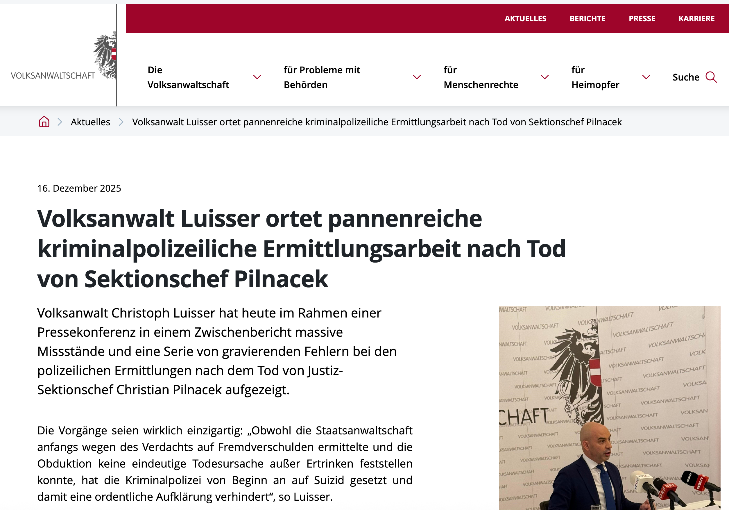 - Volksanwalt Luisser ortet pannenreiche … – Volksanwaltschaft, Zugriff am Dezember 21, 2025, https://volksanwaltschaft.gv.at/leichte-sprache/aktuelles/artikel/volksanwalt-luisser-ortet-pannenreiche-kriminalpolizeiliche-ermittlungsarbeit-nach-tod-von-sektionschef-pilnacek/