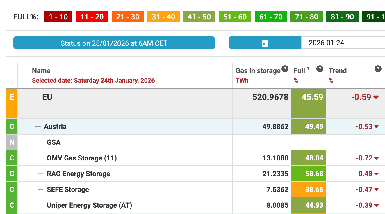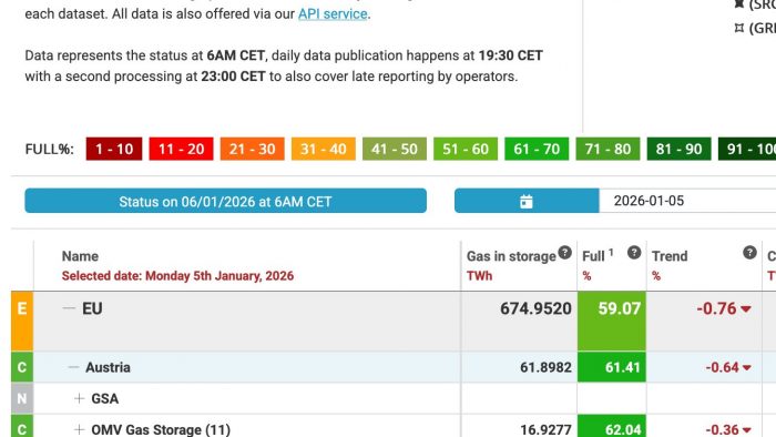 Sollten die aktuellen Gasfüllstände (Screenshot 070126) in Österreich nicht eine Alarmmeldung beim zuständigen Minister und unserer Regierung auslösen? EU 59% – Österreich 61%.
