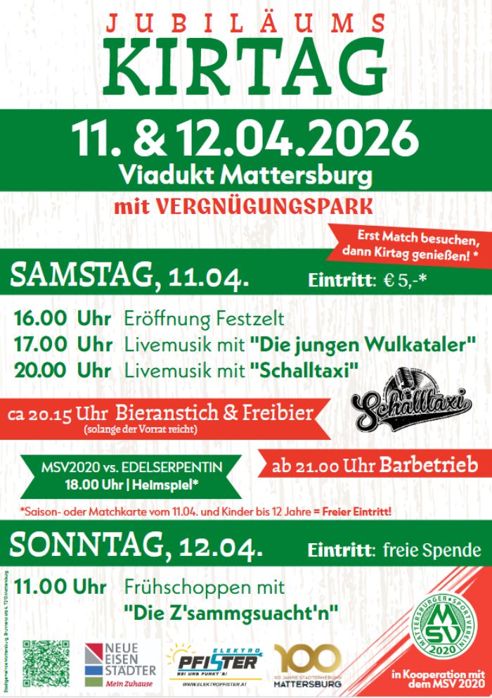 Im Rahmen des Jubiläumsjahres „100 Jahre Stadterhebung Mattersburg“ zählt der Jubiläumskirtag zu den besonderen Veranstaltungshöhepunkten in der Stadt. Am 11. und 12. April 2026 lädt die Stadtgemeinde Mattersburg zu zwei Tagen voller Musik, Kulinarik und Unterhaltung.