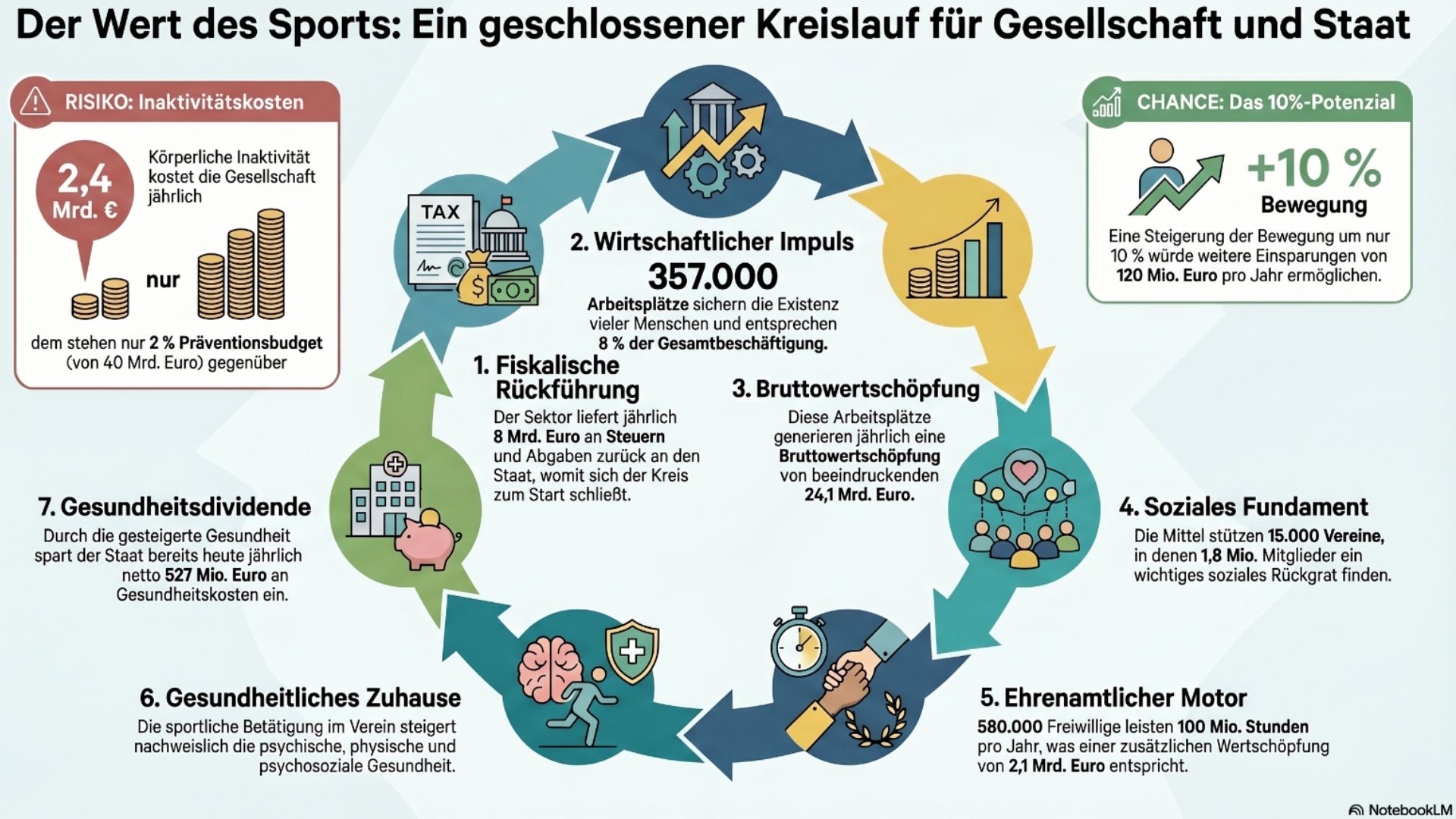Ein weiteres Sparpaket zulasten des Sports hätte also weitreichende negative Auswirkungen auf internationale Sporterfolge sowie auf Prävention, Integration, gesellschaftlichen Zusammenhalt und nicht zuletzt auf staatliche Einnahmen (!) aus Steuern und Abgaben. Denn die Rücklaufquote von 8 Mrd. jährlich wäre definitiv so nicht mehr aufrechtzuerhalten: Weniger Mitteleinsatz bedeutet folglich viel weniger Hebelwirkung.